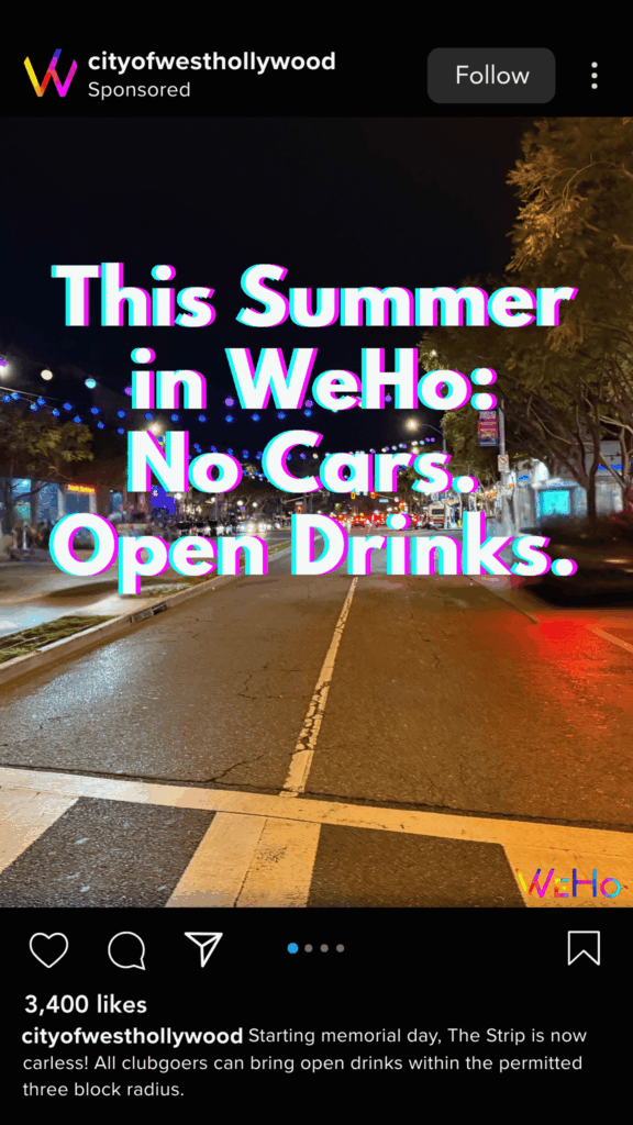 No cars in WeHo is a new policy that frees the three streets on Sunset Blvd from the nusiance of cars. Carless WeHo allows patrons to walk back and forth between the streets with open drinks — transforming The Strip into a walkable environment — and giving opportunity to happenstance.