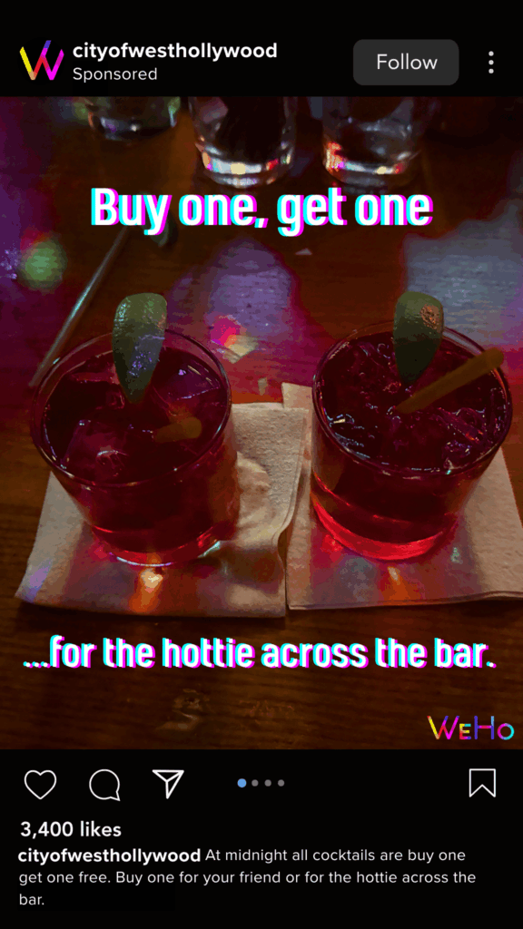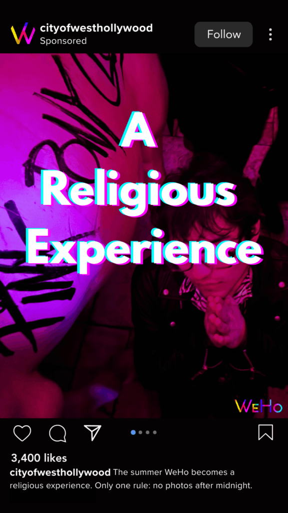 The Abbey is infused with religious undertones. This Instagram advertisement makes a play on that theme to create a mysterious vibe for the rebranding of WeHo. The caption continues to emphasize that mystery by centering the new policy: no photos after midnight.