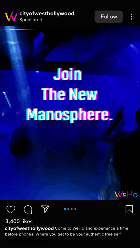 The manosphere has become a cultural hot topic as “podcast bros” and “trads” find a safe for misogyny online. This Instagram advertisement pokes fun at the performance of online masculinity and turns it into a call for the gay men to come join the “new mansophere” that is inclusive and welcoming.