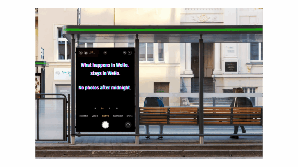 This bus shelter advertisement shares the new policy for WeHo clubs — no photos after midnight. This new policy reinforces the safety of being your real authentic self, freedom to express without fear of reprecussions, and an opportunity to live in the moment.